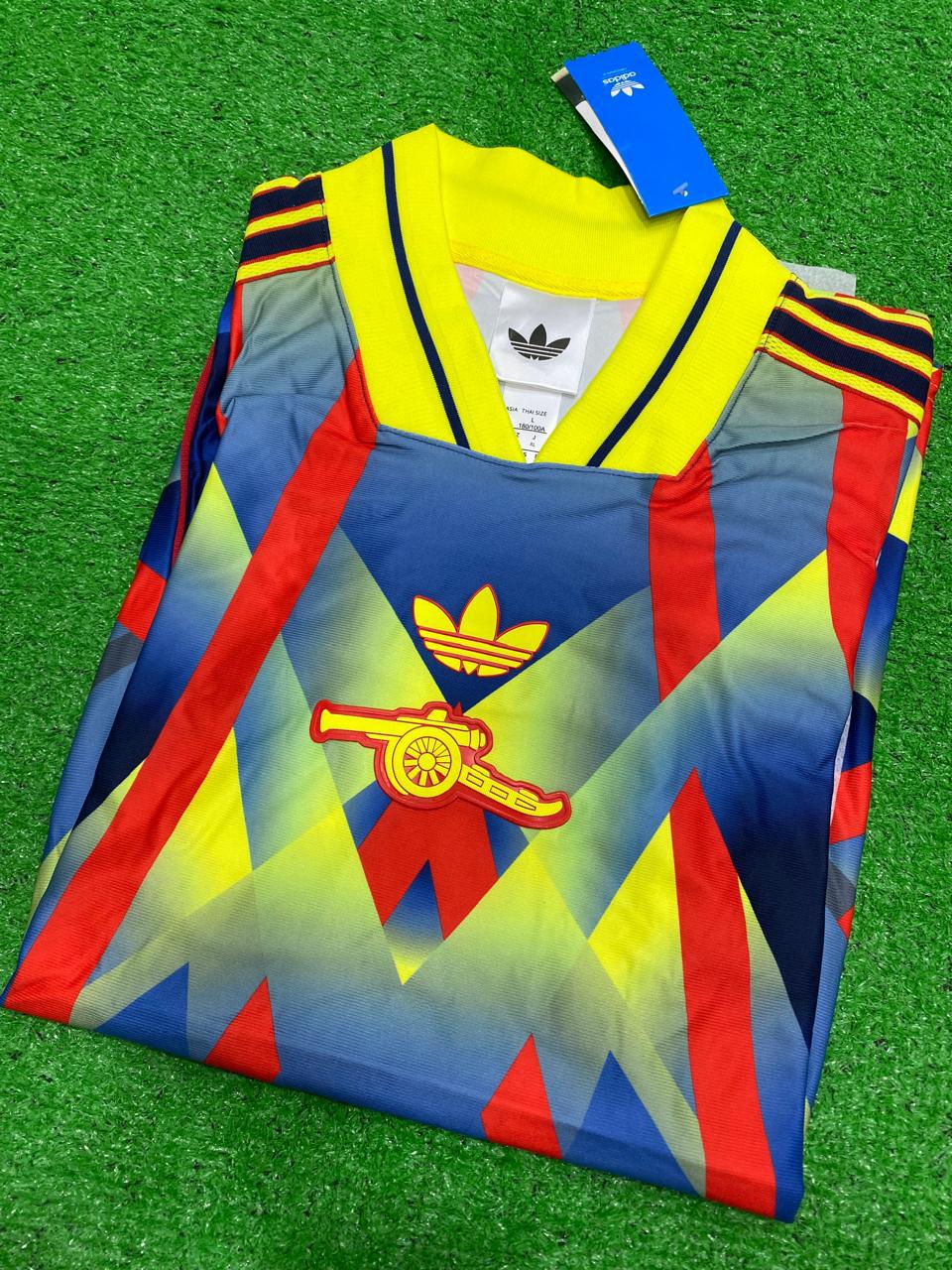 Featuring an eye-catching geometric pattern in deep navy, electric yellow, and striking red accents, the jersey delivers a powerful visual identity inspired by classic terrace culture. The vibrant yellow V-neck collar and gold three-stripe detailing elevate the look, while the iconic Gunners crest at the center commands attention.